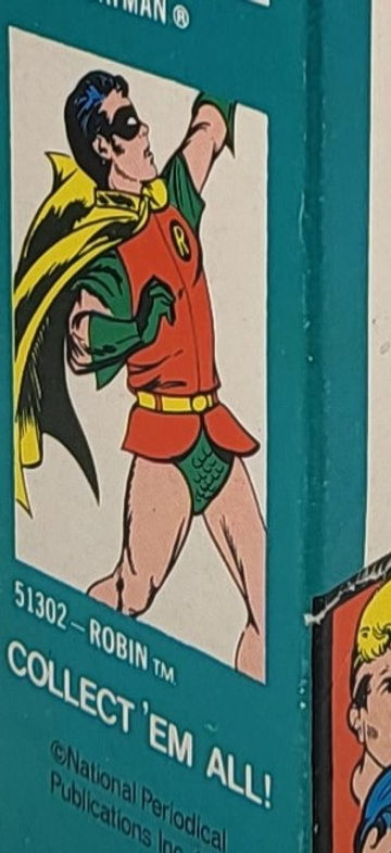 1st and 2nd generation window boxes DO NOT have a perforated hang tab on the back of the box, while all 3rd generation and later boxes DO have a perforated hang tab, including all of the super-gals (Batgirl, Wonder Woman, Catwoman, and Supergirl), the villains (Riddler, Penguin, Mr. Mxyzptlk, Joker, Lizard, and Green Goblin), and the later issued heroes (Green Arrow, Falcon, Iron Man, Hulk, Conan, Thor, Mister Fantastic, Invisible Girl, Human Torch, Thor, and Isis).